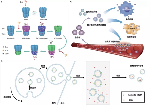 (b) 以外泌体为代表的胞外囊泡纳米机器用于药物递送;